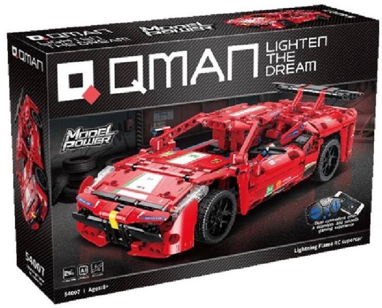 QMAN ® 54007, technic-kompatibilis távirányítós autós építőjáték, 571 db építőelem, Lightning Flame piros versenyautó (app + controller)
