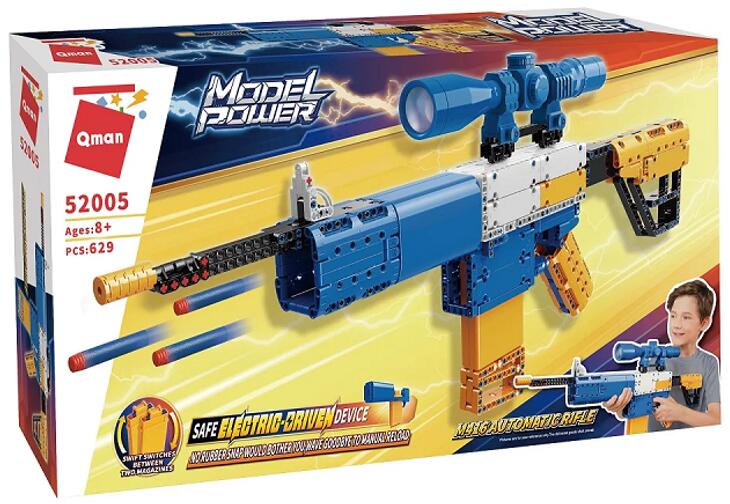 QMAN márkájú, minőségi, Lego-technic-kompatibilis építőjáték. Az élethű 75,5 cm hosszú játék gépkarabély, szivacstöltények kilövésére is alkalmas. Elektromos hajtású újratöltéssel, két db tárral és 8x -os nagyítású távcsővel rendelkezik. A játék 629 db építőelemből áll, és 8 éves kortól ajánlott. Qman 52005 lego technic kompatibilis építőjátékTechnikai/technic elemekből állíthatod össze ezt az építőjátékot. NERF szivacslövedékkel is tölthető. Ez a haladóknak való építőjáték NEM a LEGO terméke, hanem a már 1994. óta létező QMAN márkájú. Az építőkockák teljesen összeépíthetők a lego technic építőkockákkal. Kötelező figyelmeztetés: 3 éves kor alatt nem ajánlott, lenyelhető kis elemek miatt fulladásveszély!Az építőjátékok új generációja kis és nagy kreatív építők, játszani szeretők számára. Nagyszerű játékvilágok, kiváló minőségű építőelemek, tökéletes építési segédletek és sok építési szórakozás nagy játékértékkel. Továbbá óriási előny, hogy minden QMAN® építőkocka 100% -ban lego kompatibilis és összeépíthető a piacvezető játékkockáival. A termékek kiváló minőségű ABS műanyagból készülnek, csakúgy mint a LEGO játékai. Természetesen tesztelik és tanúsítják őket káros anyagok és biztonság szempontjából. Megfelelnek az európai játékbiztonsági szabvány (EN71) szigorú követelményeinek.